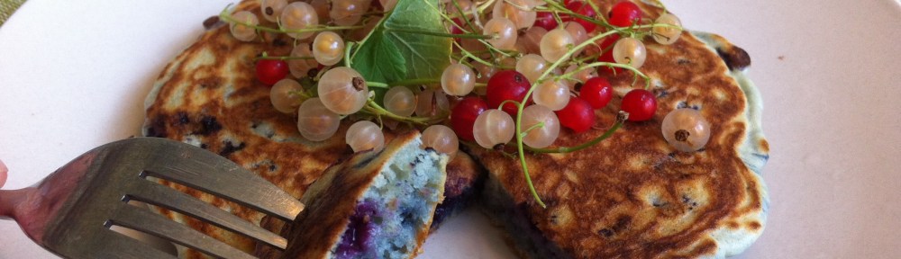 Blanda ihop de torra ingredienserna. Vispa sedan ner äggen och beroende på äggens storlek, alltså hur blöt smeten är, ta mer eller mindre mjölk. smeten ska vara betydligt tjockare än vanlig pannkakssmet men fortfarande rinnig. Blanda ner ca 1 dl frysta blåbär, smeten kommer nu tjockna lite mer. Skopa upp smeten på en stekpanna på medelvärme (de bränns lätt om värmen är för hög), du kan behöva fördela smeten för hand då den är precis på gränsen lös nog att glida ut av sig själv. Stek tills bubblorna på ytan början ”poppa” och vänd pannkakan (men håll hela tiden koll på undersidan så den inte hinner bli bränd innan det är dags att vända). Grädda brun på andra sidan också. Färdigt!