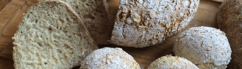Häll ordentligt med mix på ett bakbord och stjälp upp degen. Den kommer nu att vara ganska kletig så rör den minimalt, men forma med snabba och lätta rörelser degklumpen till ett bröd. Spreja med vatten och strö över lite havreflingor som du klappar in i brödytan. Strö över mix för att fylla ut mellanrummen och klappa in det med. Stjälp försiktigt över brödet på en het plåt (eller helst en uppvärmd baksten, vilket är vad jag använt till bröden på bilden) och grädda 10 min i 250 grader. Sänk därefter temperaturen till 200 grader och grädda ytterligare 30 min. Av detta får du ett härligt fluffigt, matigt bröd.